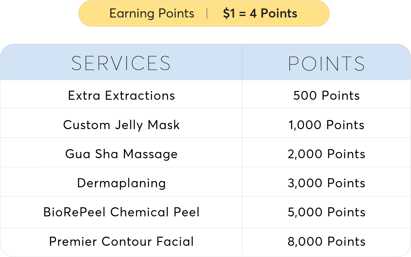 Members, all of your favorite skincare products can earn you Loyalty Points!  Enhance your journey to healthier skin by converting every dollar spent on retail products into redeemable points toward facial services. Our Loyalty Points Program for Members is designed to focus on your skincare goals while enjoying cost-saving benefits.